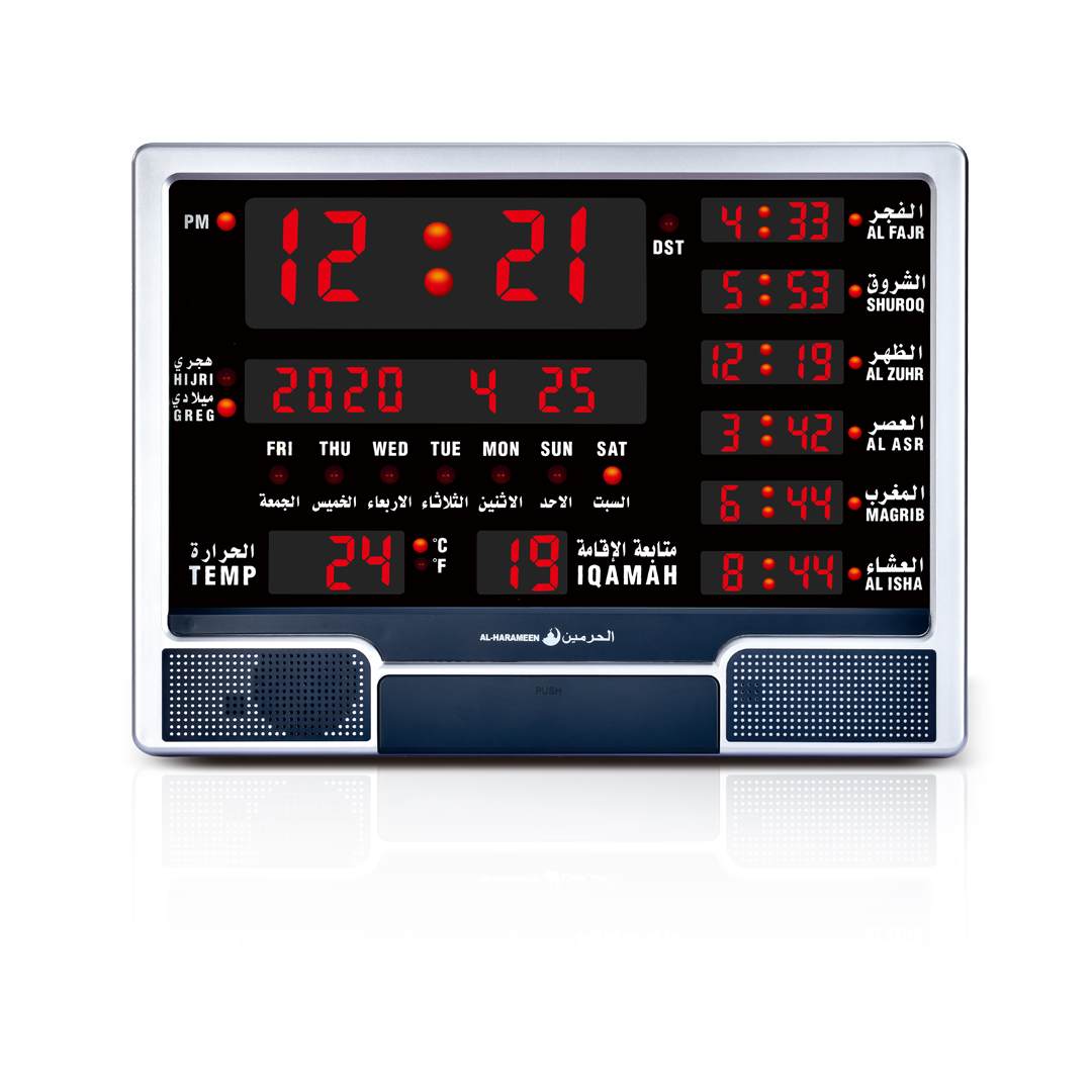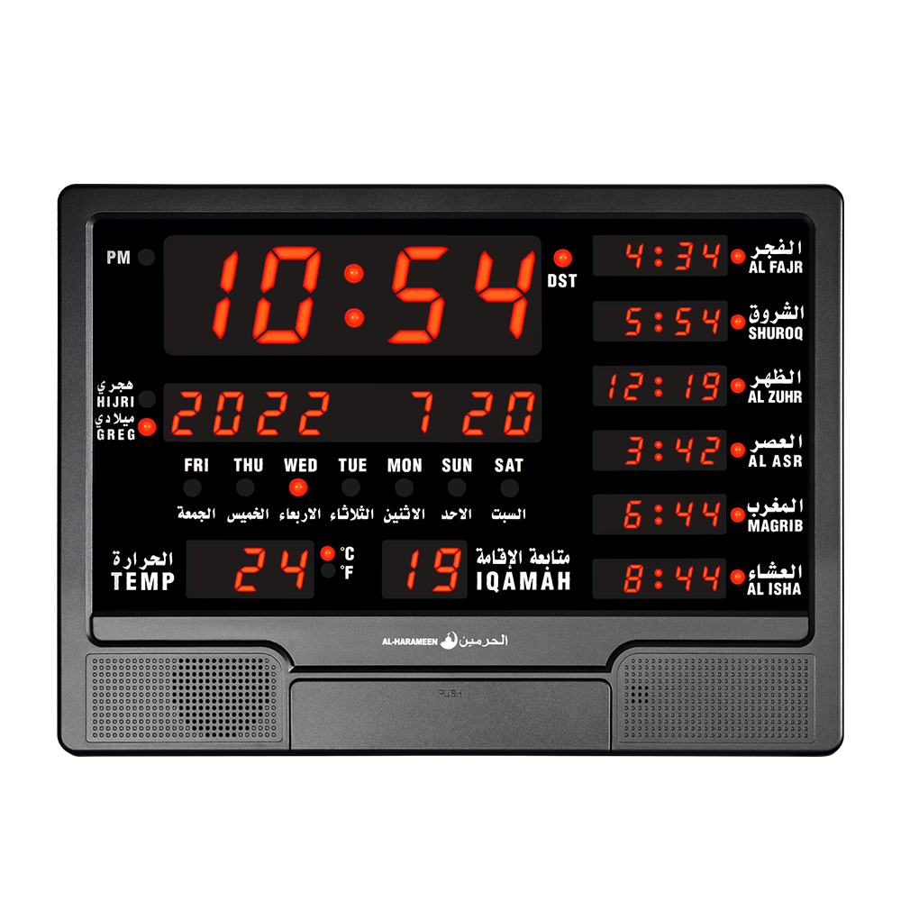 - ساعة الحرمين مكتبية وحائطية بشاشة رقمية واضحة ومضيئة، مزودة بأذان كامل للصلوات الخمس و منبه لكل صلاة. مثالية للبيت، المكتب، والمساجد مع عرض التقويم الهجري والميلادي.