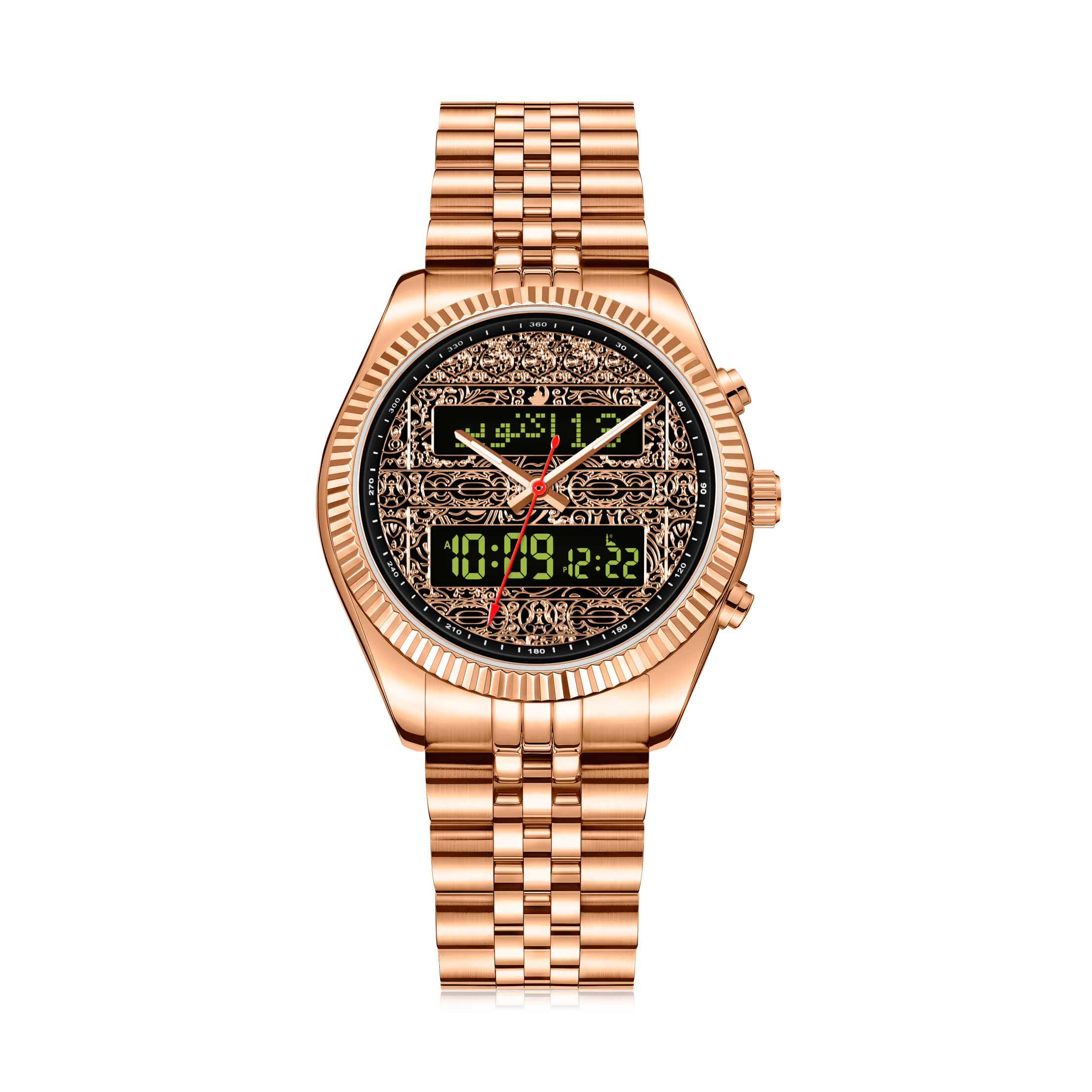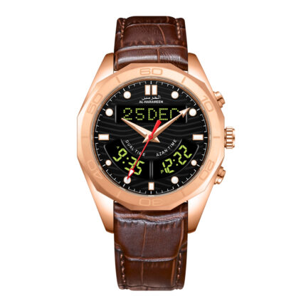 ساعة الحرمين الرجالية الفاخرة HA.6109 اختيار مثالي للرجل اللي يهمه المظهر الأنيق والالتزام بوقته وعبادته. تصميم راقٍ بتوقيت مزدوج (عقارب ورقمي) مع تقنيات إسلامية ذكية تخليك مطمئن للصلاة واتجاه القبلة أينما كنت.
