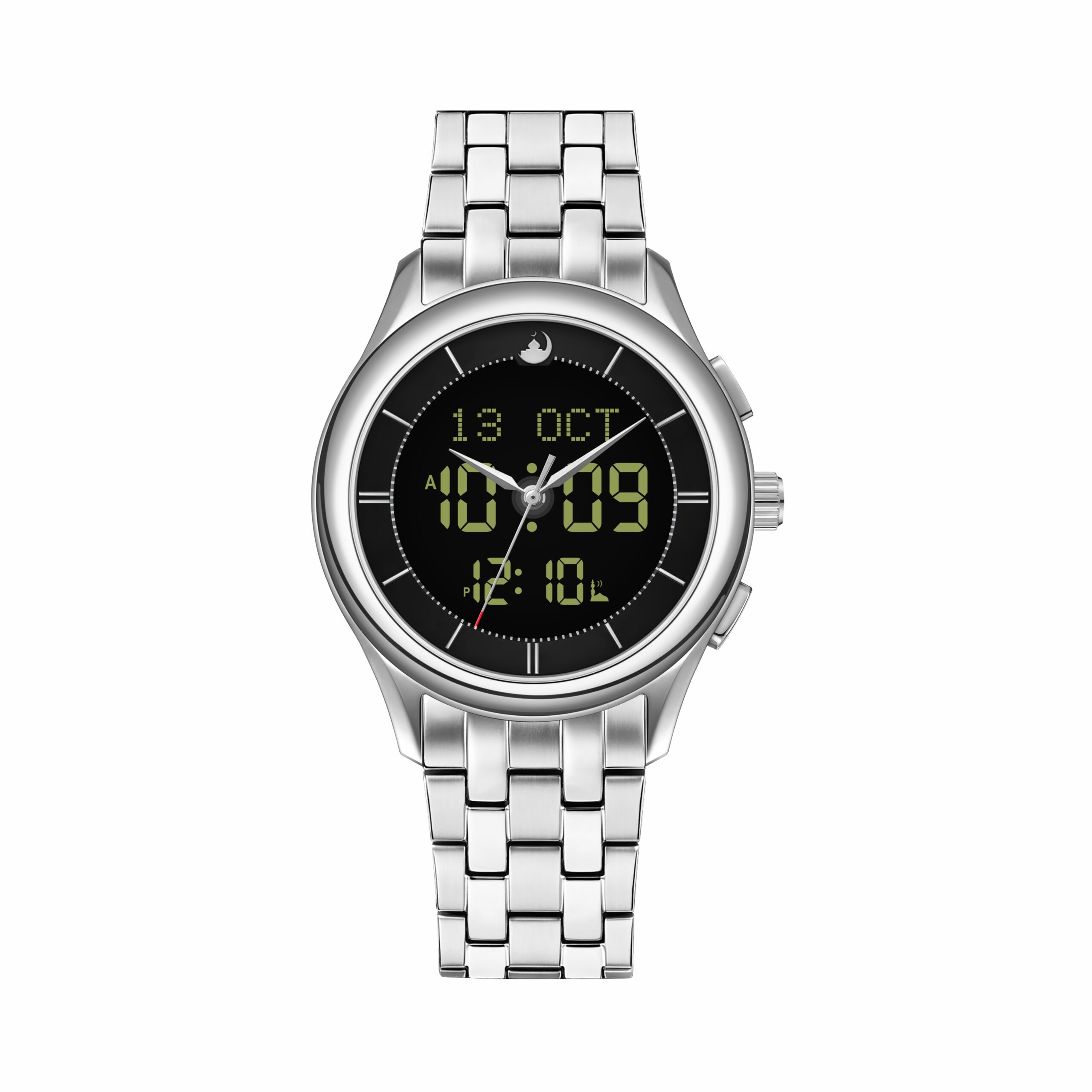- ساعة فاخرة تجمع بين الأناقة الكلاسيكية والتقنيات الإسلامية الذكية… لتصلك الصلاة في وقتها وأنت مطمئن وأنيق.