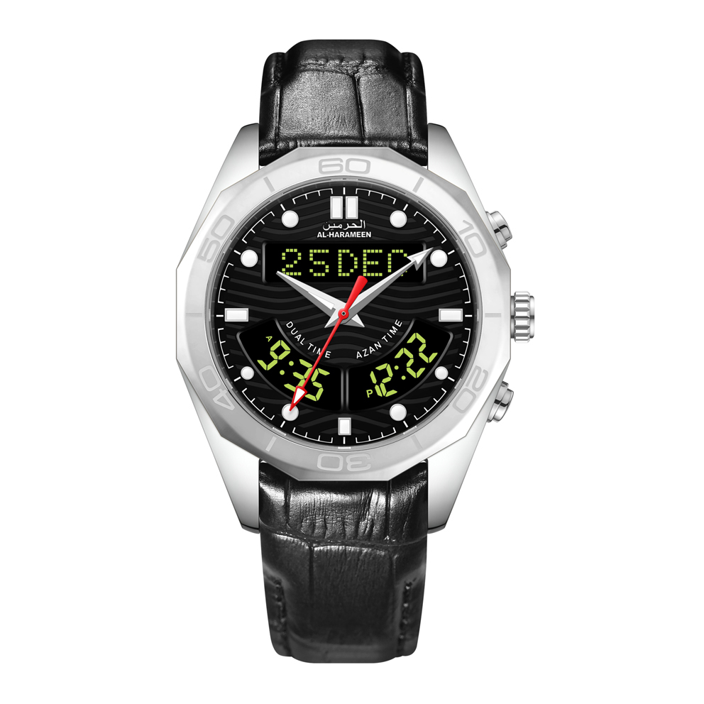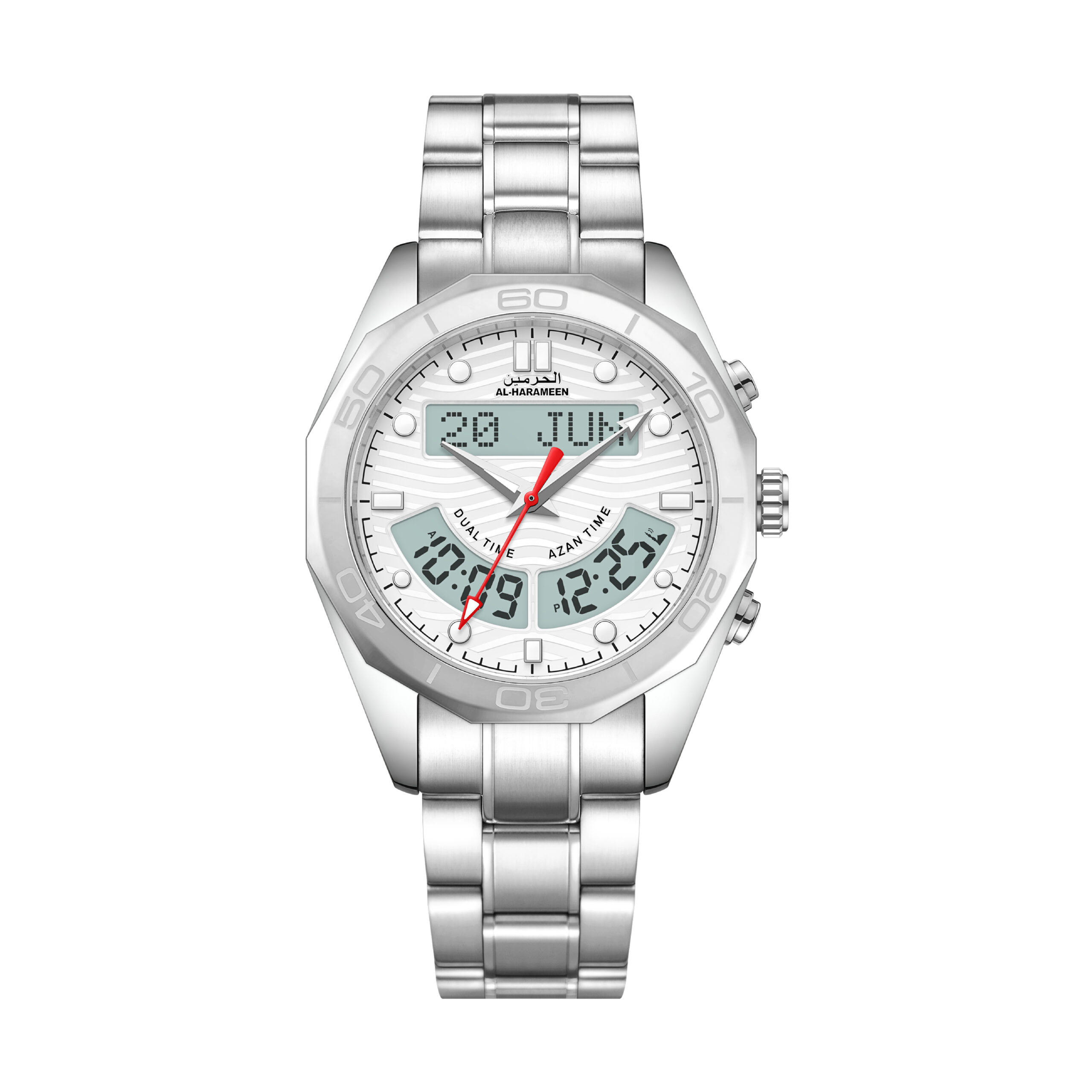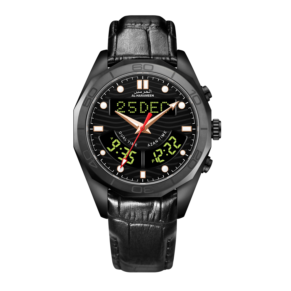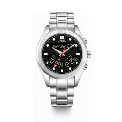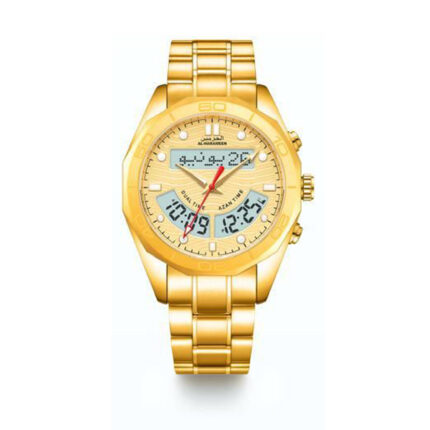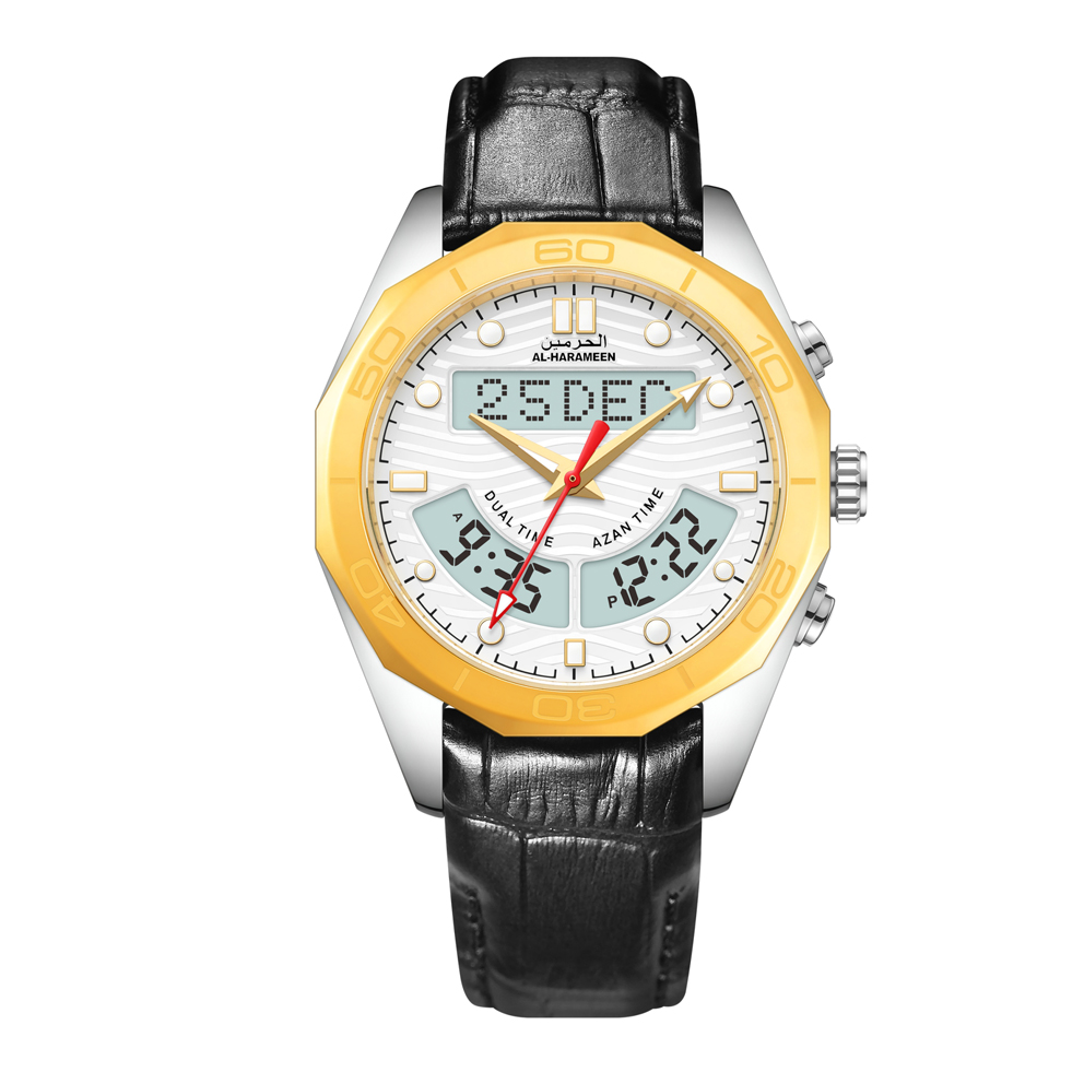ساعة الحرمين الرجالية HA.6117 بتصميم فاخر يجمع بين التوقيت المزدوج (عقارب + رقمي) وسوار وإطار من ستيل مقاوم للصدأ باللونين الذهبي والفضي اللامع. ساعة عملية وراقية، مزودة ببوصلة إلكترونية لتحديد اتجاه القبلة، وتقويم هجري وميـلادي، ومنبه مستقل لكل صلاة، لتكون رفيقك المثالي أينما كنت حول العالم.