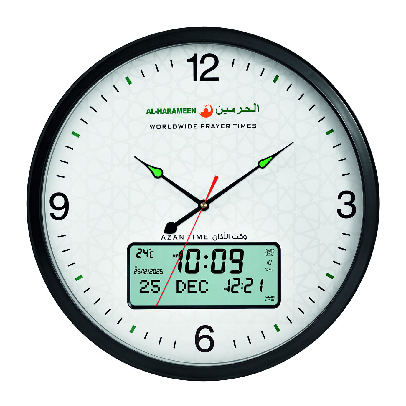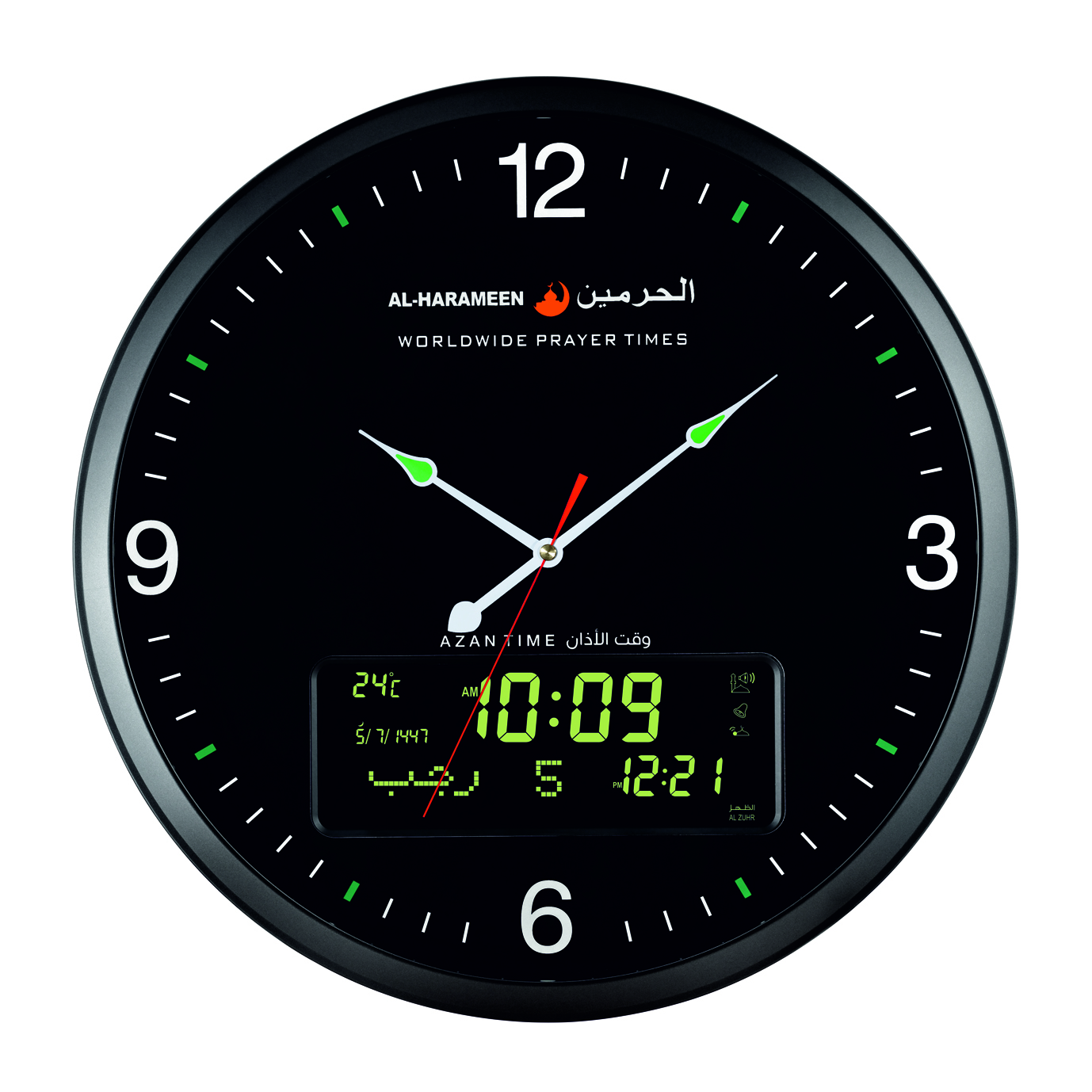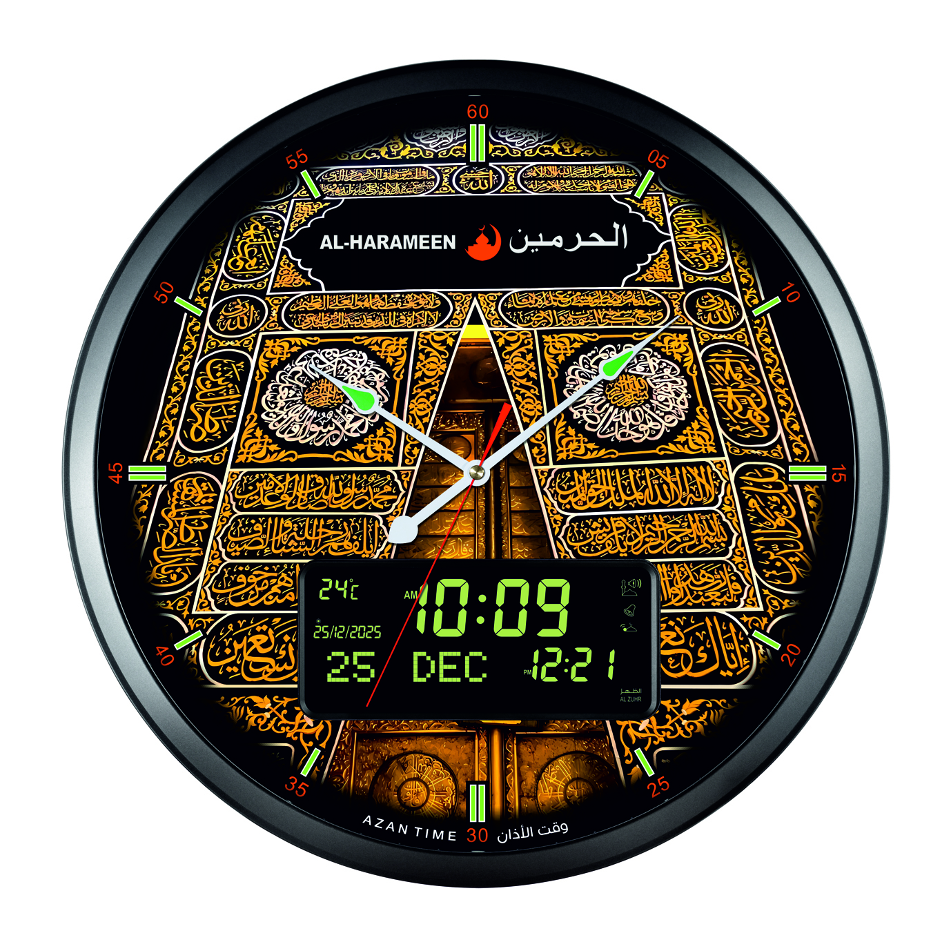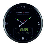 ساعة الحرمين دائرية بخلفية أنيقة، مزودة بعقارب و أنالوج رقمي مزدوج، مع أذان كامل للصلوات الخمس و منبه لكل صلاة. مثالية للبيت والمكتب والمساجد.
